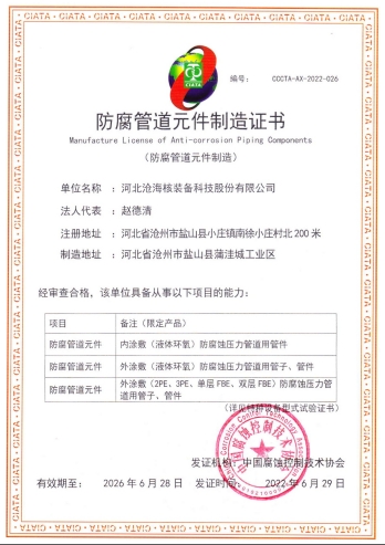 河北滄海防腐管道元件制造證書
