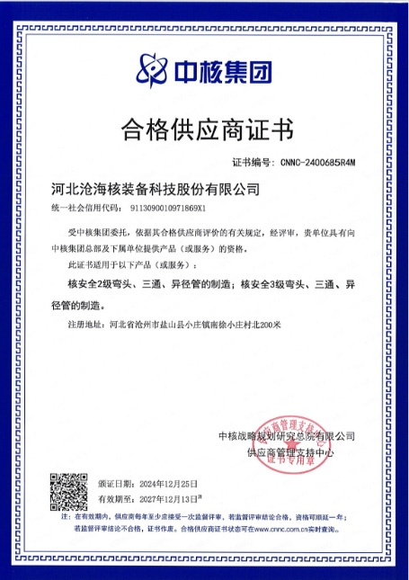該合格供應商證書的取得,是對河北滄海核裝備科技股份有限公司公司產(chǎn)品和綜合實力的肯定,標志滄海核裝滿足核工業(yè)領域的相關要求。公司將以此為契機,繼續(xù)堅持創(chuàng)新驅動發(fā)展,加強與中核集團的合作力度,為國家核電工業(yè)的發(fā)展做出貢獻。